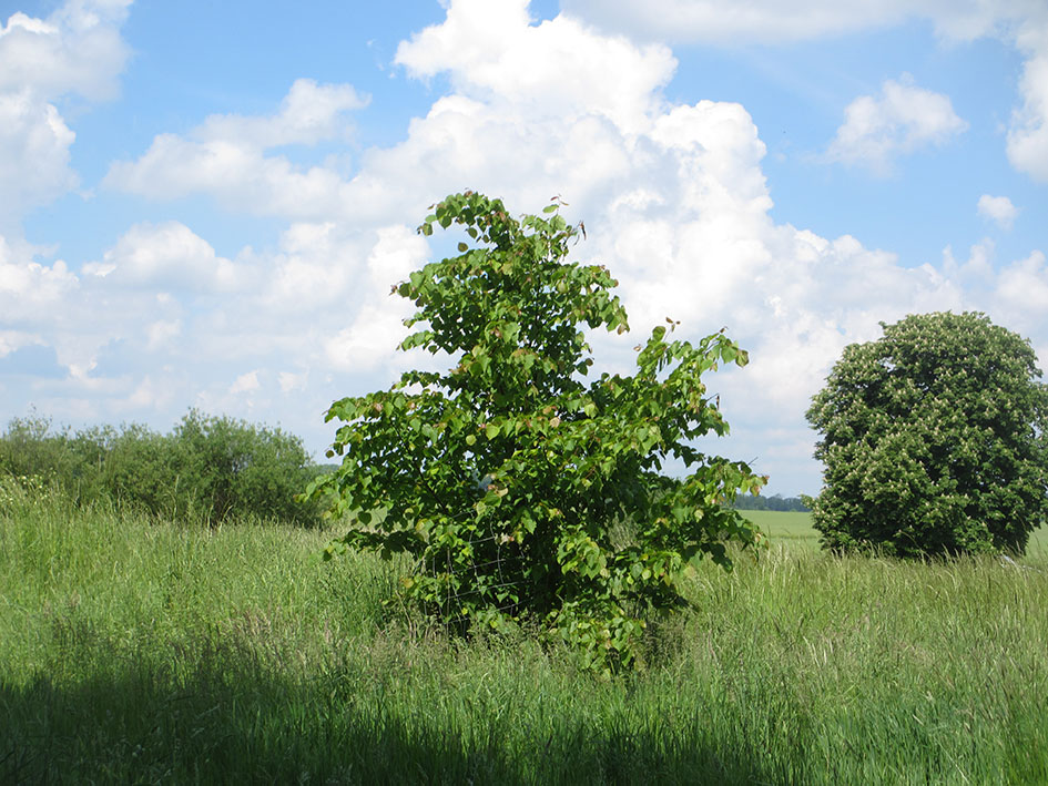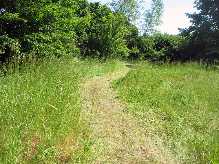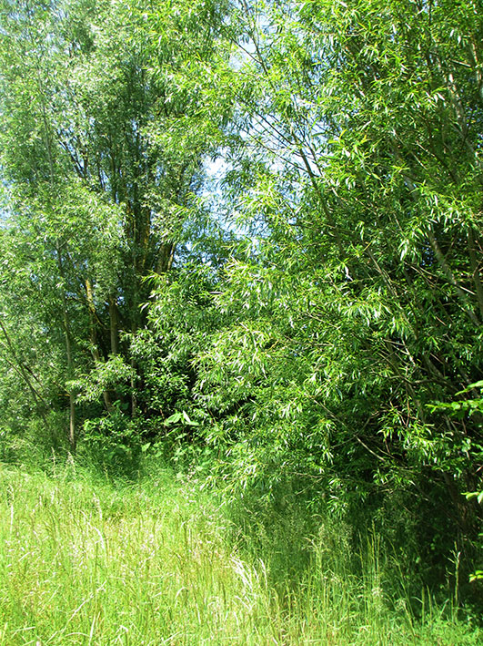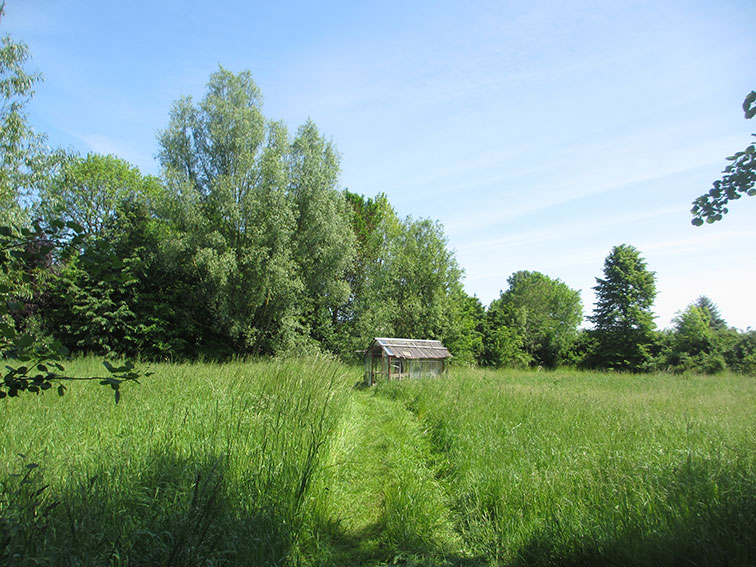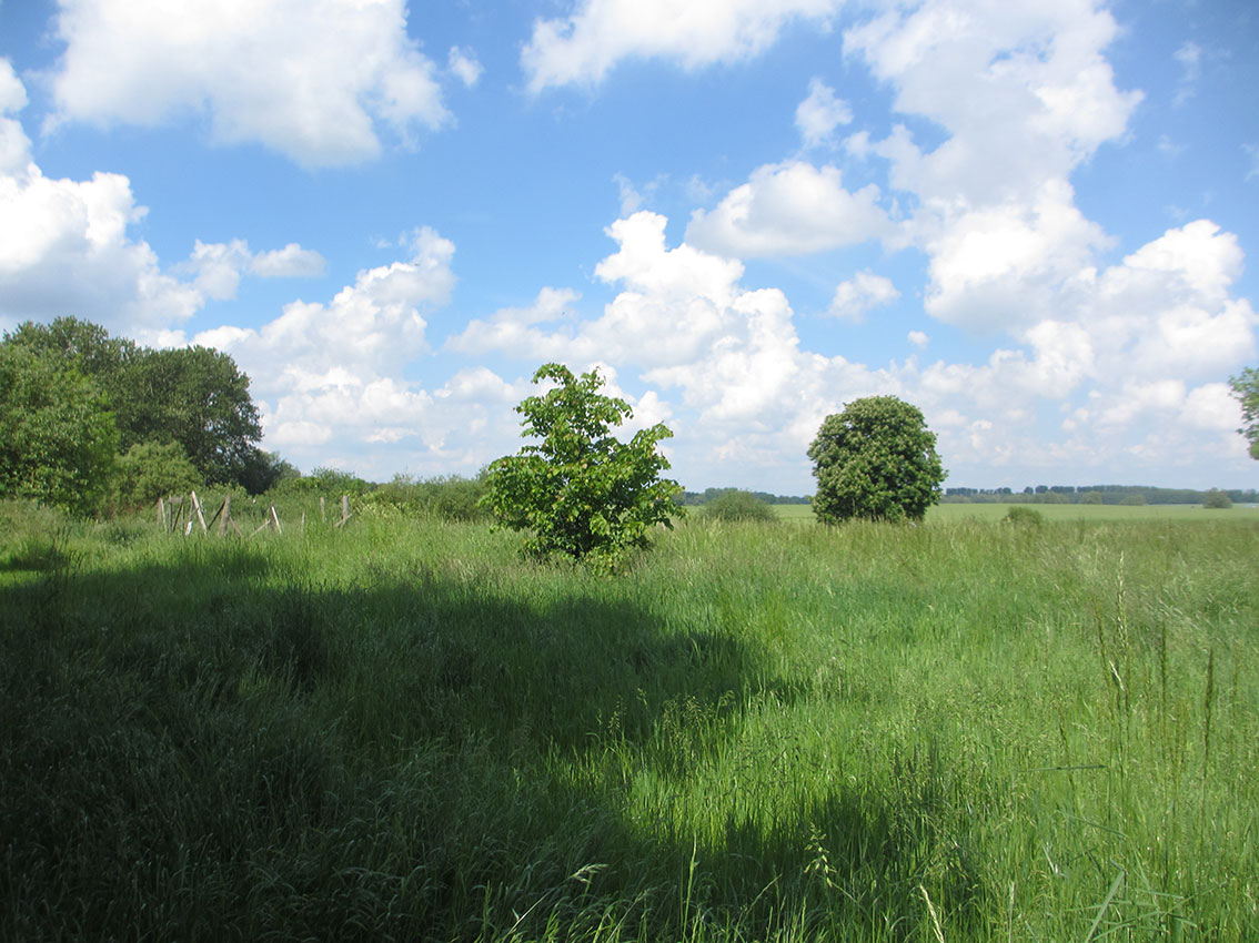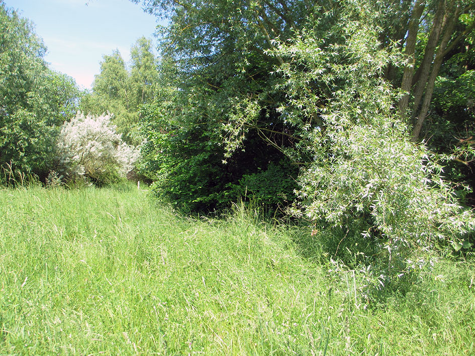 Da war eine Koppel mit einem Graben an dessen Ufern Sträucher und Bäume mit einem Weg wie einen Brücke hinüber. In Richtung der Felder. Uns.