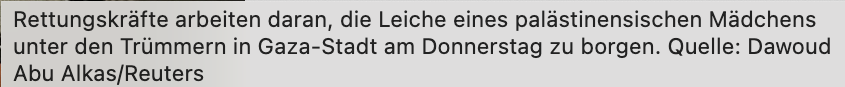 Rettungskräfte arbeiten daran, die Leiche eines palästinensischen Mädchens unter den Trümmern in Gaza-Stadt am Donnerstag zu borgen.Quelle: Dawoud Abu Alkas/ReutersAm Wochenende forderten sie Entscheidungsträger zum Handeln auf. Schließlich, so argumentierten sie, bieten die 500 frisch geblendeten Menschen im Libanon, ein Ergebnis explodierenden Pager, eine goldene Gelegenheit, die in absehbarer Zeit nicht zurückkehren wird. Also, was zum Teufel warten Sie darauf, den Krieg zu beginnen?
