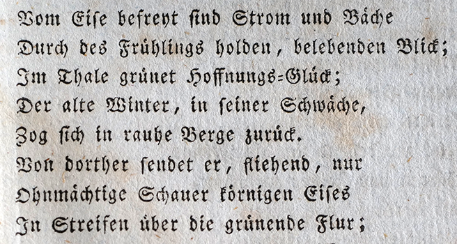 Vom Eise befreit sind Strom und Bäche Durch des Frühlings holden, belebenden Blick; Im Tale grünet Hoffnungsglück; Der alte Winter, in seiner Schwäche, Zog sich in rauhe Berge zurück...