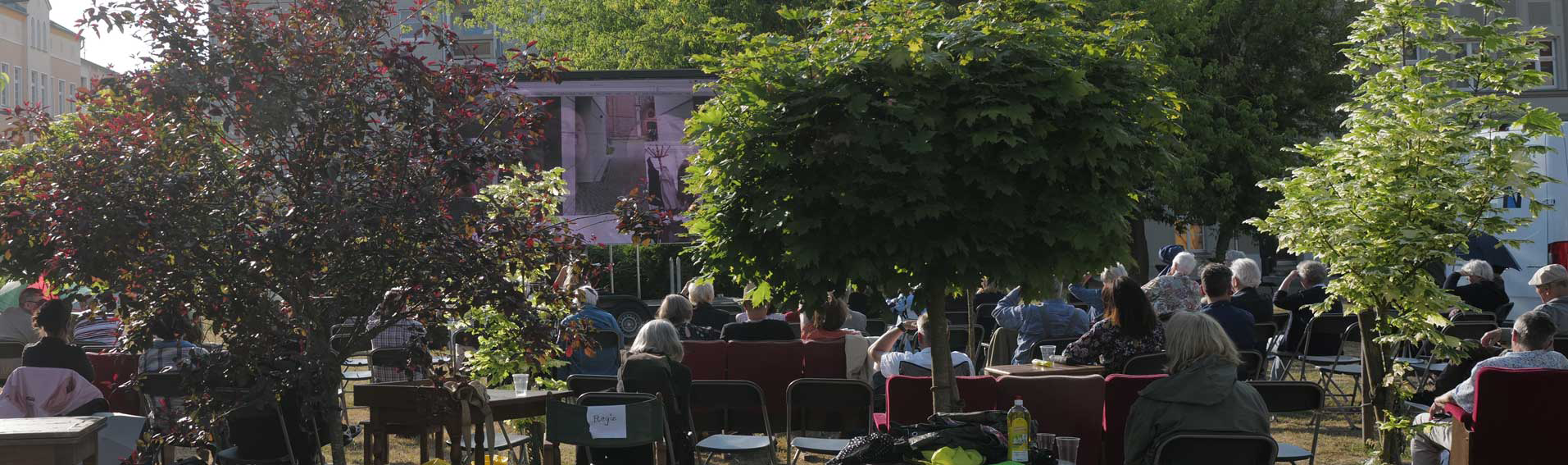 Lange nachgedacht wie diesen Film aus Demmin aufführen, zum ersten Mal. Weltpremiere. In Demmin. Auf dem Platz, den es seit langem nicht mehr gibt. Ohne Haus mit offenem Himmel. Dass es ein Bild wird. So kamen die Bäume dort in den Blick und Tische mit beweglichen Stühlen darunter mit einer Leinwand in den Himmel unter Schirmen für Sonne und Regen auf natürlichem Rasen. Aus dem Nichts in die Gesänge. Was sonst.