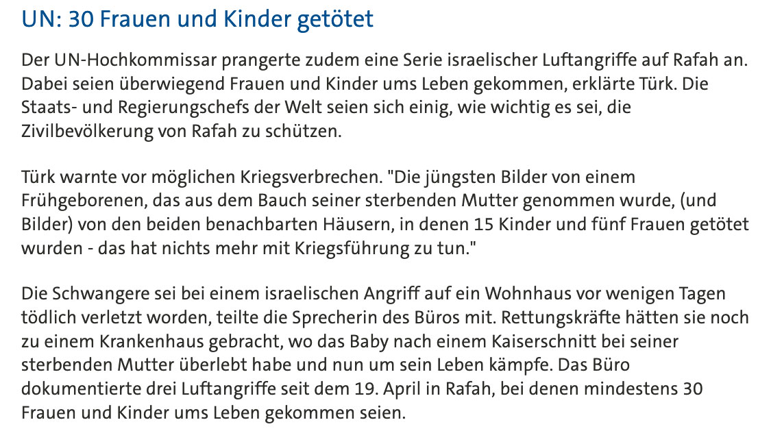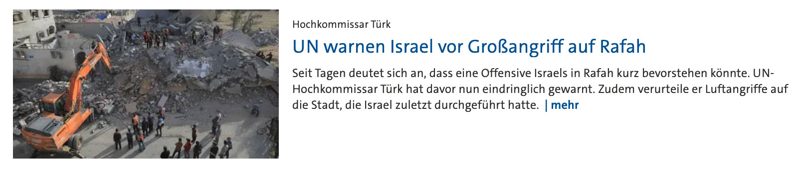 - Eine unabhängige Überprüfung durch die UNO hat ergeben, dass Israel keine Beweise für seine Behauptungen vorgelegt hat, dass viele Mitarbeiter des UNRWA Mitglieder von Terrororganisationen in Gaza sind. Die Überprüfung der "Neutralität" der Agentur, angeführt von der ehemaligen französischen Außenministerin Catherine Colonna, ist getrennt von einer weiteren UN-Untersuchung der Wahrhaftigkeit der Behauptungen Israels, dass 12 UNRWA-Mitarbeiter an den Anschlägen vom 7. Oktober beteiligt waren.