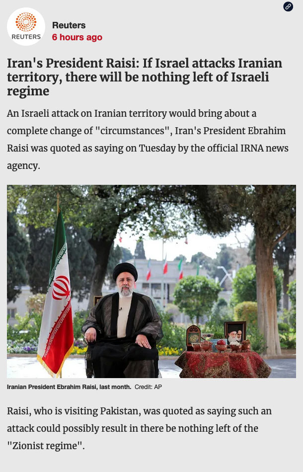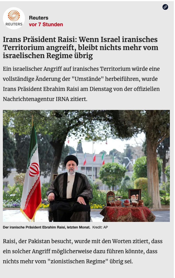 - Irans Präsident Ebrahim Raisi sagte, dass ein israelischer Angriff auf iranisches Territorium eine vollständige Änderung der "Umstände" herbeiführen und zum Ende des "zionistischen Regimes" führen könnte, so die Nachrichtenagentur IRNA.