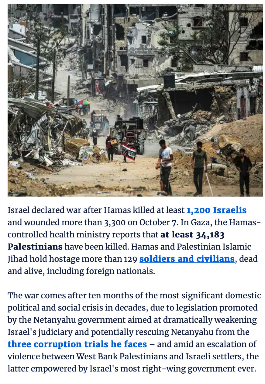 - Nach Angaben des von der Hamas kontrollierten Gesundheitsministeriums in Gaza wurden seit Beginn des Krieges mindestens 34.183 Palästinenser getötet und 77.143 verletzt.