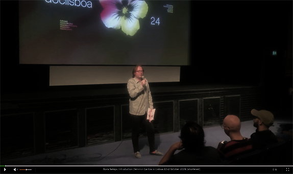 „Es ist nicht so, dass man jeden Tag die internationale Premiere seines Lieblingsregisseurs präsentieren kann. Der Film ist ein sehr intimer Film, und ich weiß, dass Syberberg geliebt und respektiert wird, besonders in Lissabon, Portugal. Und dieser Film sieht fast so aus wie um seinen Traum zu verwirklichen, den Künstler in seinem Haus zu besuchen und den Film so intim zu gestalten, dass man fast das Gefühl haben könnte, neben ihm zu sitzen und dem Historiker zuzuhören, denn dieser Film, den er wirklich großzügig begleitet, begleitet großzügig mit seinen Bildern, aber auch mit seine Stimme. Der Film, den Sie in diesem Video sehen werden. Im Grunde basiert er in vielerlei Hinsicht auf seinem Blog, den er seit dem Jahr 2000 schreibt. Wenn Sie ihm nicht folgen, sollten Sie ihn sich unbedingt ansehen, denn , weil er in diesem Jahrhundert keine Filme gemacht hat. Aber dieser Blog ist wie sein Kunstprojekt, und er lädt jeden Tag etwas hoch. Äh, er macht neue Beiträge, äh, in seinem Buch über sein Leben und über seine Stadt. Und in Tatsächlich schreibt er, wie letzte Woche, viel über dieses Ding und verschiedene schöne Dinge, die Ich wollte mit ihm zum Beispiel Antonio Costa teilen, der sein Programm macht, und, wie Sie sich erinnern, die Perspektive von Syberberg nutzt. Und er kam persönlich, vor fast zehn Jahren, um seine Filme vorzustellen und Antonios und präsentieren Bilder, die ich mit Syberberg geteilt habe, liebt und erinnert sich an Lissabon. Wie Sie auch schon aus meiner Einführung entnehmen konnten, kommt er leider heute nicht persönlich zur Vorführung. Er hatte geplant und wollte wirklich kommen, aber in Im letzten Moment haben wir entschieden, dass es zu hart wäre und wir ihm die Reise zumuten würden, aber wir haben eine kleine Einführung mit ihm aufgenommen, die Sie sehen werden, weil ich denke, dass der Film, weil der Film nicht einfach ist.Und es Es braucht etwas Geduld, um in diesen Film hineinzukommen. Aber der Film ist auch nicht einfach, weil er einen sehr schmerzhaften Kontext der Geschichte Europas und der Geschichte des 20. Jahrhunderts hat. Und, ich fand seine Präsentation und seine Einführung ist wirklich schön, weil er sozusagen Motive und großartige Möglichkeiten zum Sehen vermittelt, als müsste man dasselbe tun. Am Anfang ist man etwas verwirrt, was er eigentlich sagen will. Wenn man den Film also beginnt, äh, zuerst mit diesem kurzen Einführungsvideo, das im Allgemeinen sehr schön ist und das speziell war, speziell für Sie. Und noch etwas, das er geschrieben hat, und zwar über seine Website, die Sie am Tag zuvor, vor der Vorführung, veröffentlicht haben, und er hat mich gebeten, Ihnen dieses Gedicht vorzulesen, was natürlich nicht so einfach ist, besonders mit mein russischer Akzent. Deshalb verweise ich Sie auch auf die Website von Syberberg, da diese heute veröffentlicht wird. Aber trotzdem möchte ich mein Bestes geben. Die alternative Formulierung im Kurs, die Demmin erreicht hat, kann nur durch die Grundlage der Welt des Dichters mit ihren Ewigkeiten, zu denen wir uns hiermit in der Gesamtheit dieser Ereignisse wenden. Während die Ereignisse jetzt und vorher, in diesem Gedicht, in der Tat, Die Verteidigung hält heute Abend ein Abendessen ab, und er wollte sagen, dass er darüber nachdachte über das Studium heute. Heute Abend in Lissabon, mit Erinnerungen an den Kinderreim (Maikäfer flieg, den Vater iust imn Krieg, dene Mutter ist in Pommerland...?)und dem Titel Demmin Cantos. Es geht um die Stadt Demmin, die in der Nähe von Syberbergs Geburtsort liegt und in der er heute lebt. Und das ist diese Stadt, die eine der Städte, die eine der höchsten, vielleicht sogar die höchste Rate an Massenselbstmorden aller Frauen, aller Kinder, aller alten Leute hatten. Sie hatten solche Angst vor Russen und Sowjets, dass sie Massenurteile in dieser Stadt vorzogen, im Wasser der Flüsse. Der ganze Film dreht sich also um dieses Projekt, und ich entschuldige mich für die lange Unterbrechung. Ein weiteres technisches Detail, das den Film ausmacht, ist, dass er in zwei Teile, in zwei Kapitel, unterteilt ist. Beide sind haben den Vorspann und den Abspann getrennt, aber wir haben keine Pause, was wie ein Film aussieht. Aber wenn Sie den Abspann sehen, ist das das Ende des ersten Teils, denn der Film besteht aus zwei Sätzen, wie in der Musik, und Dieser zweite Satz ist ganz anders.“