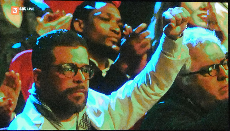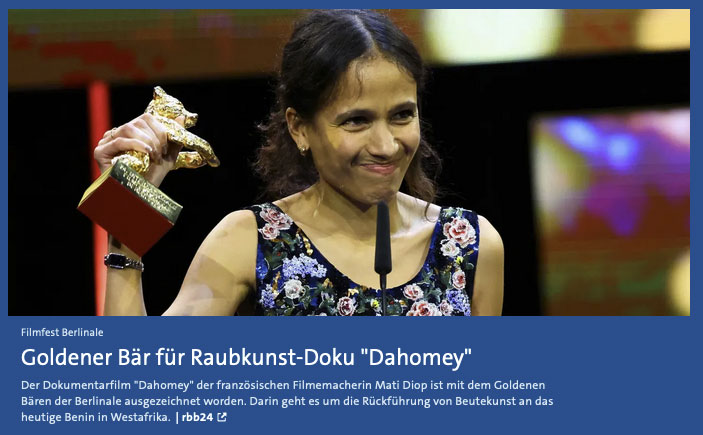 Unten sitzt harmos klatschend die Staatsminsterin für Kultur, zuständig auch für unserer Präsentation der koloonialen Beutekunst im neuen Schloss Berlin.