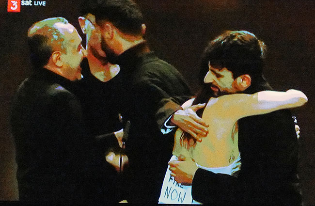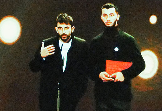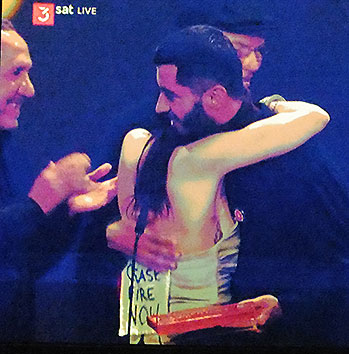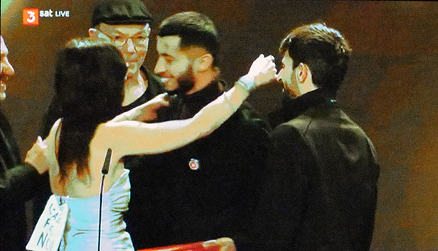 Vorher die Nebenkategorien, kleinen Preise. Dokumentarfilme auch. Und da kam der Hammer. Dass dieser Film, wenn überhaupt entstanden, ausgewählt, zum Thema geehrt würde immer hin. Thema Israel, Westjordanland oha, Palästina! zusammen als Co-Prod. sagt man dazu, extra eine Hütte vor dem FestvalPalast zum Reden in kleinen Gruppen 5 Personen, übersichtlich alles organisert, liegt in der Luft neben AfD, haben wir im Griff.