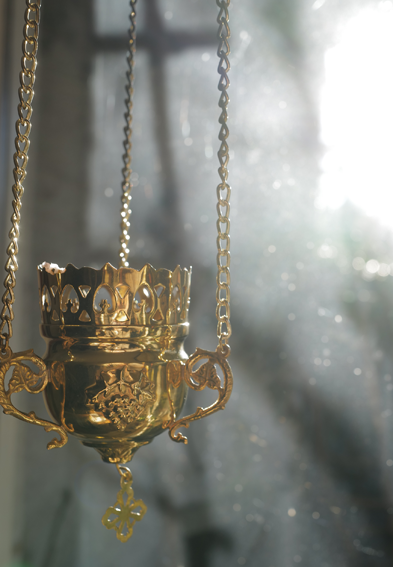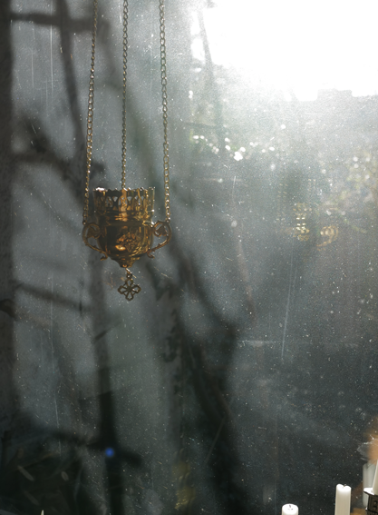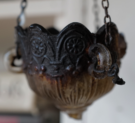 Die alte russiche Lampe wird bedacht. Öl fasst sie nicht mehr. Eine Ruine der letzten Explosion. Not dürftig als Form des Erinnerns wieder hergestellt.