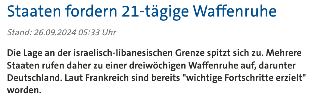 Und dann wird eine Rakete auf den Großraum Tel Aviv abgefeuert, wie es am Mittwochmorgen der andere und eine weitere folgte, trotz der großen Erfolge der Luftwaffe und der beeindruckenden Daten über "reduzierende Fähigkeiten". (Jeder Krieg und seine sprachliche Innovation: "das Manövrieren" in Gaza, "verursachende Fähigkeiten" im Libanon.) Israel erwägt immer noch keine Bodenoperation.