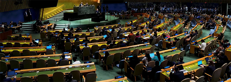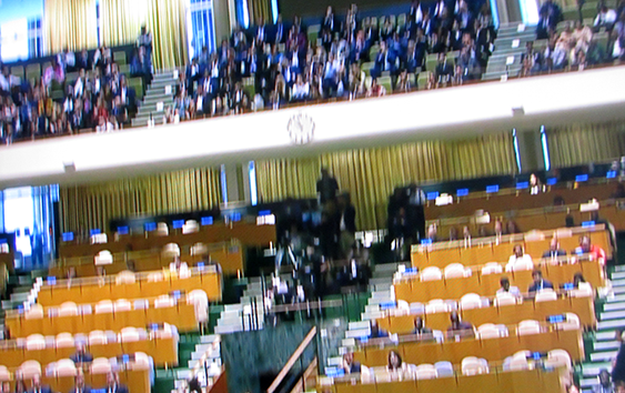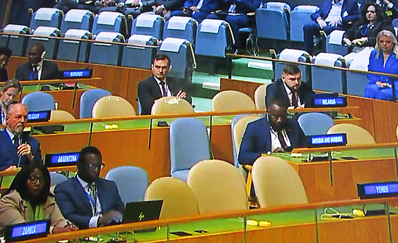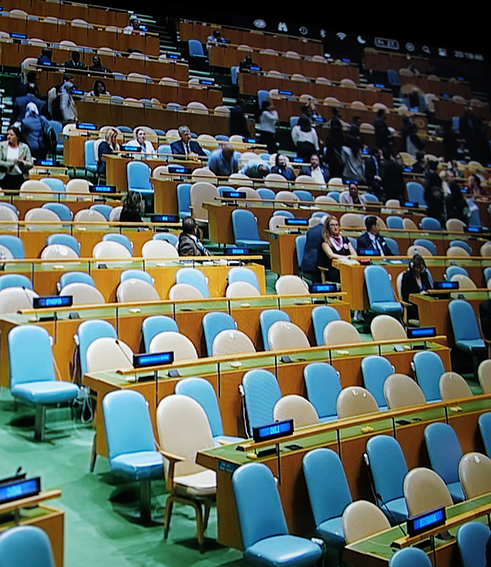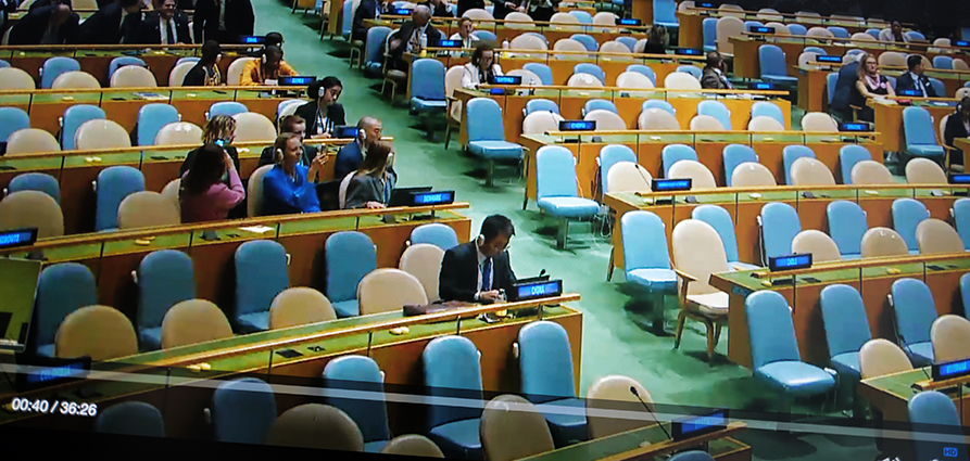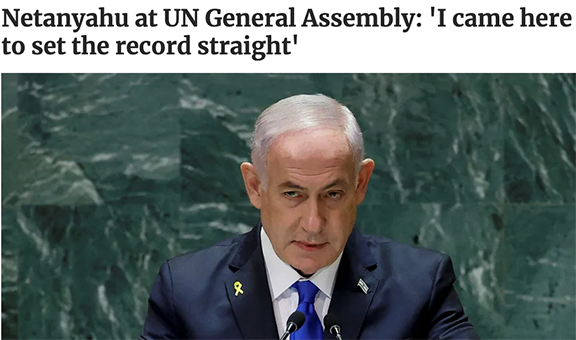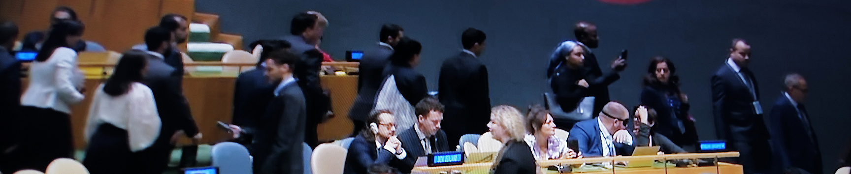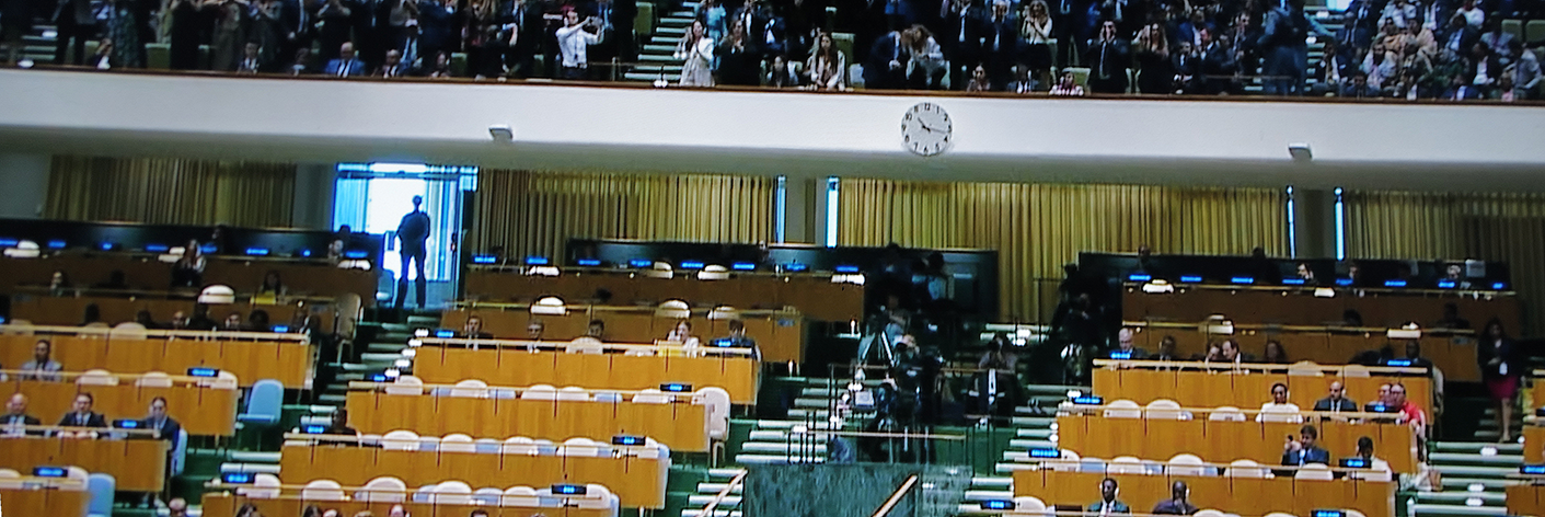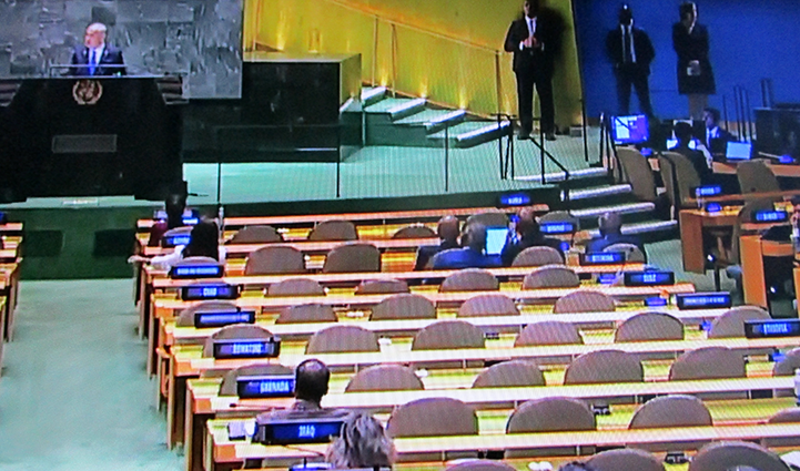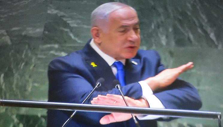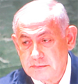 Am Anfang der Reportage aus dem Planarsaal der UN in New York der Auftritt des Ministerpräsidenten aus Israel an der Hand seiner Gattin aus der Glastür links vom Podium. Bis sie sich trennten. Er zu seiner Rede. Vor den ausgedünnten Saal der Delegierten aus der Welt. Er hatte es wieder mal geschafft.