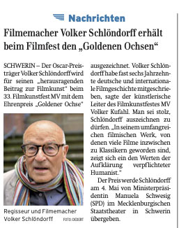 Die Ablehnung des aktuellen Films Der Demminer Gesänge in Schwerin im Rahmen des Programms " was gerade ensteht" während des Filmkunstfestes im Mai zu zeigen, demnächst hier. Im Fernsehen erscheint der Film am Ende der Filmwochen MV am 8. Mai.