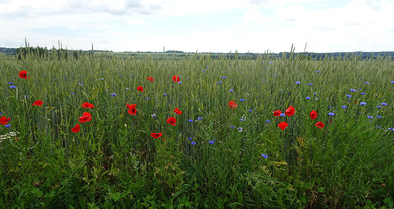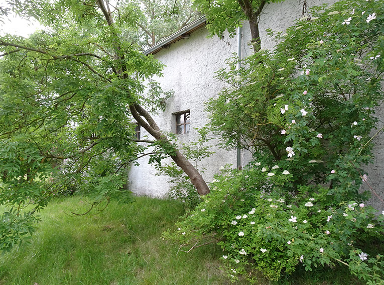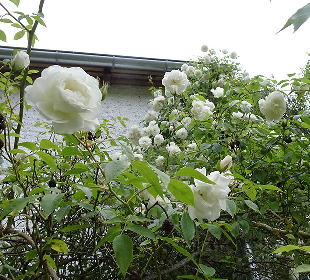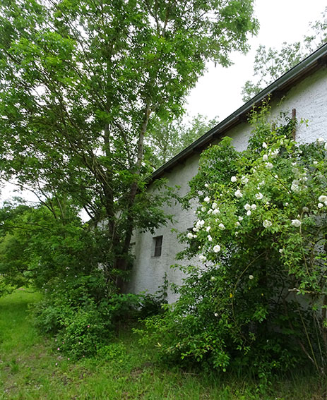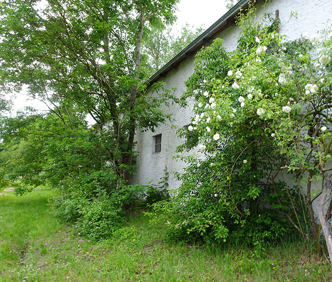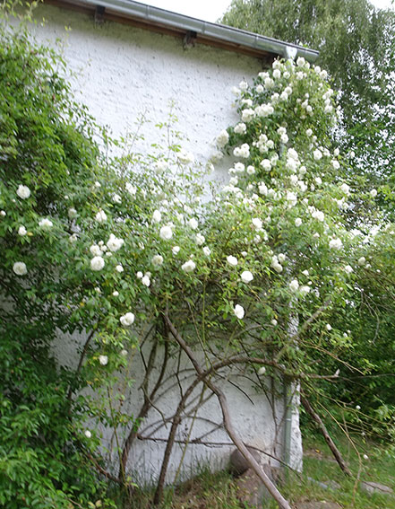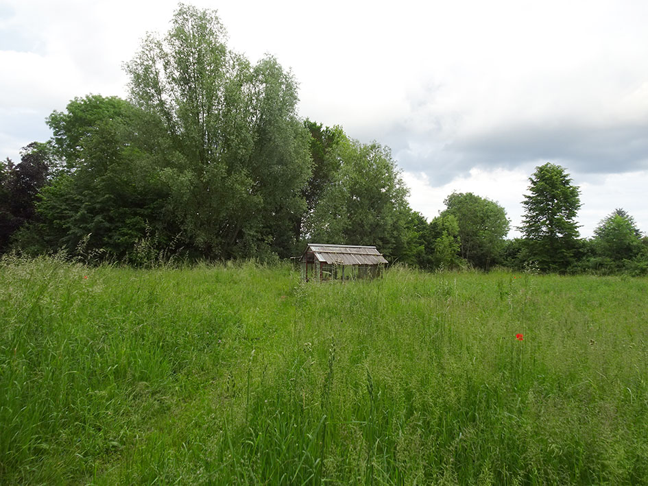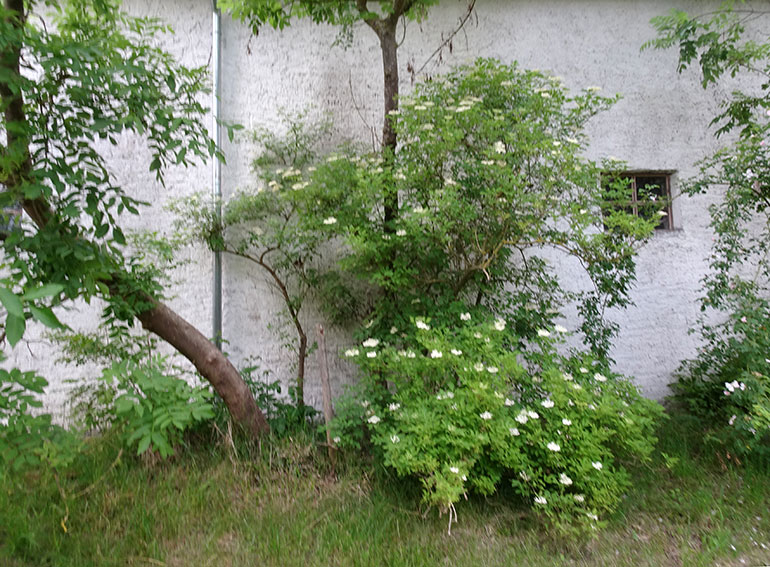 Wo diese Bäume stehen, Welt-rettend, befand sich der Graben, dessen Wasser durch die Felder fliessen, eiszeitlich, in die Trebel und Peene, aus dem wir die Stadt Demmin brennen sahen mit den Tausend Toten, Müttern und Kindern. Als er von der LPG unter die Erde verlegt wurde in ein Rohr, da lag er nun unter der Erde mit Beton darüber. Des Schweigens befestigtes Monument. Das soll nun so bleiben. Ohne Bäume weil ihre Wurzeln das Rohr beschädigen sollen. Davor das kleine Haus aus Glas auf vergiftetem Grund mit den Blumen nun. Auch im Winter.