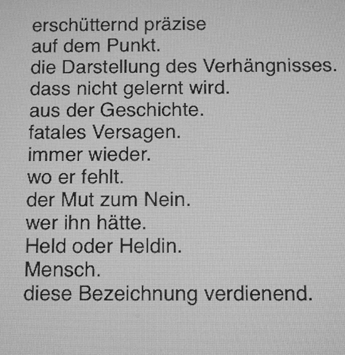 Das führte danach zur Wiederherstellung des verlorenen N. und zu den Gesängen aus Demmin, noch immer gelähmt in seiner Realitätä von heute . Aber in den Gesängen geweckt und etwas motiviert zu so etwas wie dieser Film hörbar zeigt.