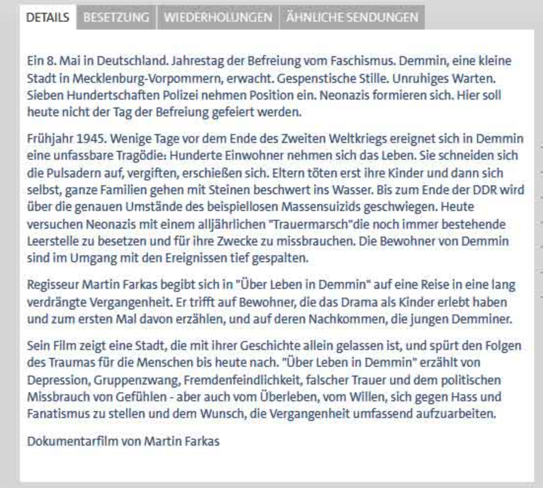 Dieser 8. Mai ist für Demmin nur ein weiterer Tag an dem die Toten einer Stadt bestattet wurden, in rauchenden Ruinen, wie verboten, von einem jungen Mädchen aufgezeichnet, die Umstände ihrer Namen, Umstände des Todes, Alterseinschätzungen. Herkünfte, in Massen Gräben. Es waren zu viele. Alles andere heute ist ist Zulieferung für Medienauftritte verrotteter Waffen. Und das ist inzwischen unsere Welt.