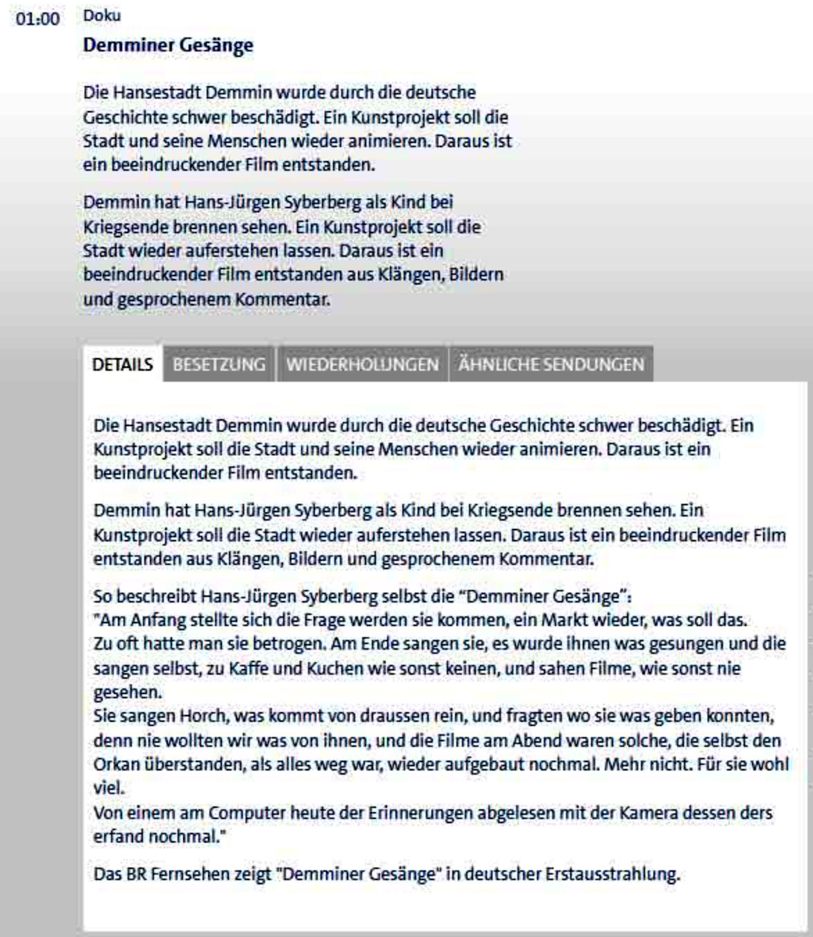 Auch dies ist ein Film aus Demmin. Der lange gebraucht hat als Bau des Markts als Film wieder zu entstehen. In wenigen Wochen montiert. In der Küche von Nossendorf. Heute im Fernsehen wie er anfängt(1.Teil). Das kommt aus dem Verborgenen, Einfachen und hat doch eine lange Vorgeschichte. Nur so ist es erlaubt. Das zu berichten, was hier geschah.