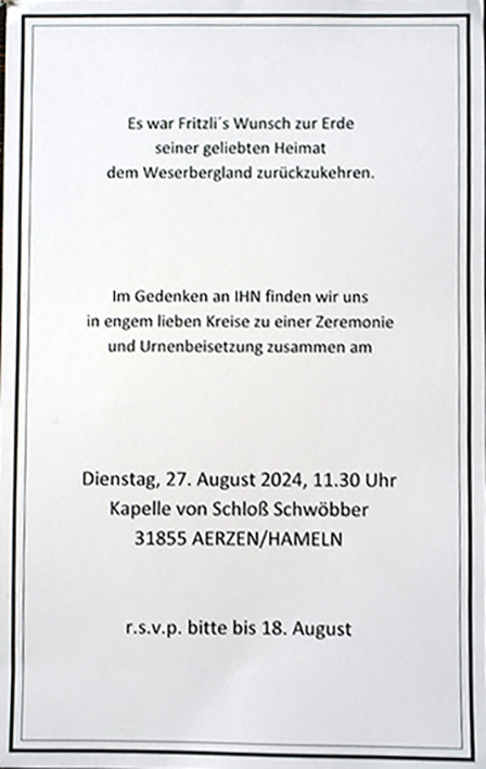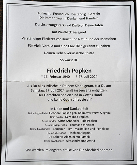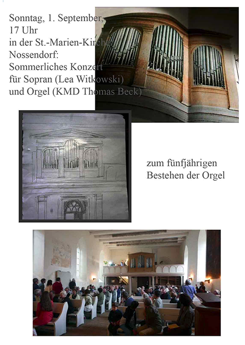 F. Popken als Freund von Nossendorf und den Aktivitäten hier kam von der Weser aus Niedersachsen. Nun ist er gestorben. Die Fünf-Jahresfeier zur Erinnerung dieser neuen Entstehung wird nun eine zu seinem Gedächnis. Ohne ihn gäbe es die Orgel nicht wieder in Nossendorf. Sie war die erste des in Pommern gerühmten Orgelbauers