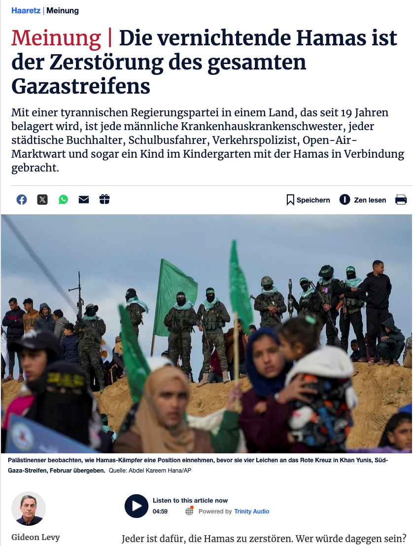 Man kann die Hamas nicht zerstören, ohne alle Männer und männlichen Jugendlichen im Gazastreifen zu töten. Jeder, der jetzt in Gaza atmet, und sicherlich jeder, der dort noch seinen Lebensunterhalt verdient, wird irgendwie mit der Hamas in Verbindung gebracht.
