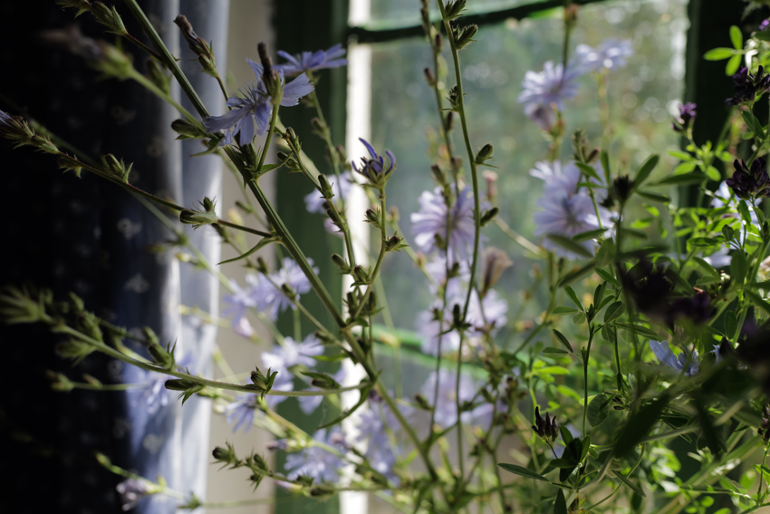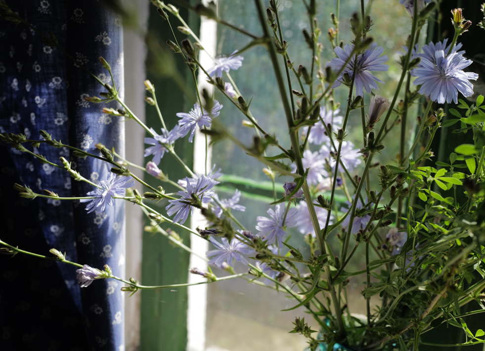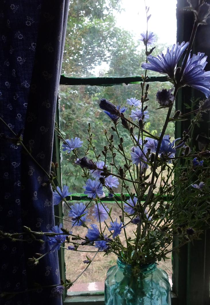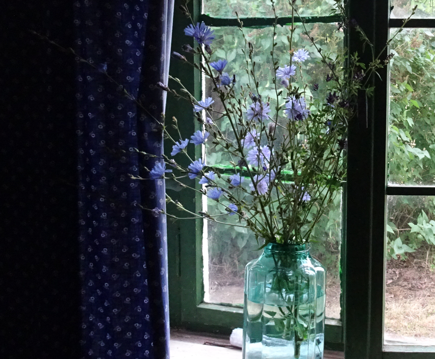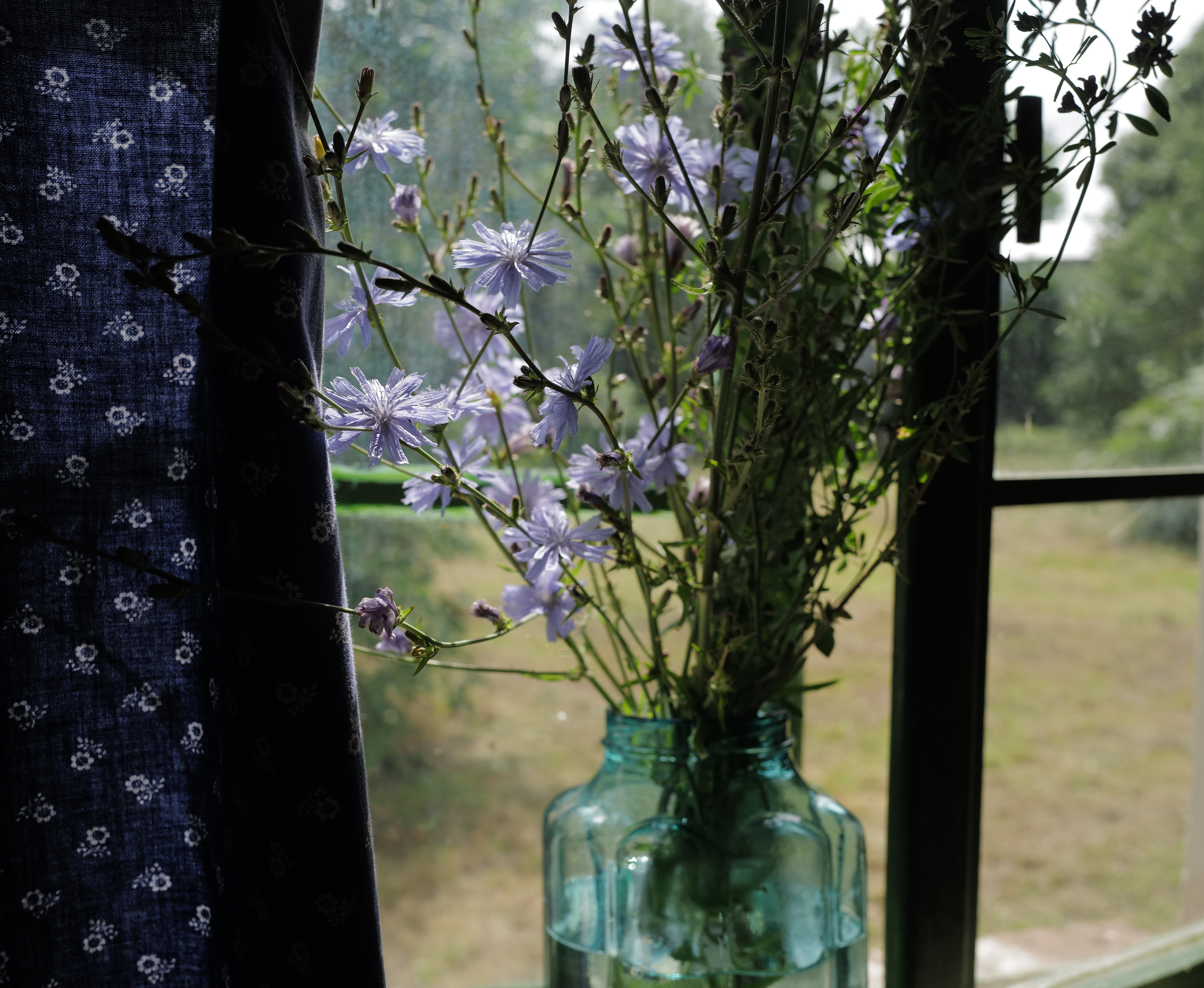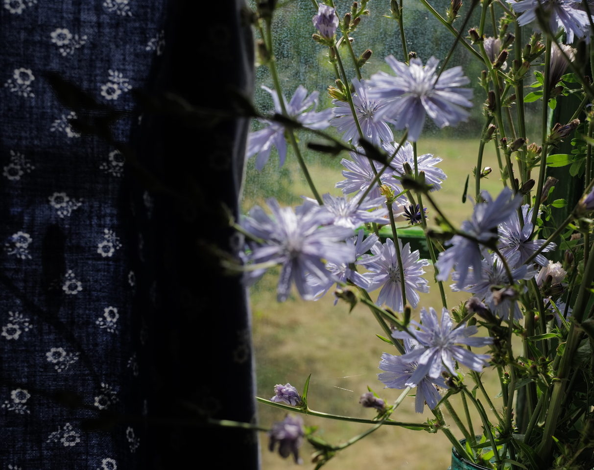 blau die Blüten und blau der Stoff auf dem sie handgedruckt nun weitertblühn