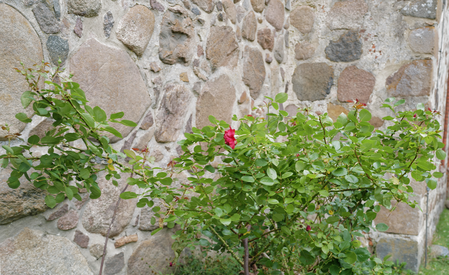 an der Kirchen Wand unter dem Turm gut versorgt die Rosen dazu