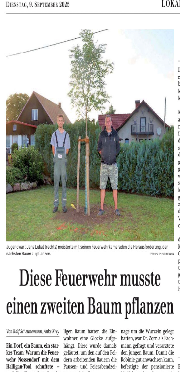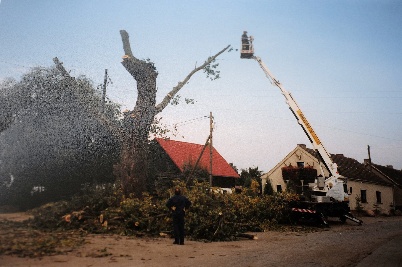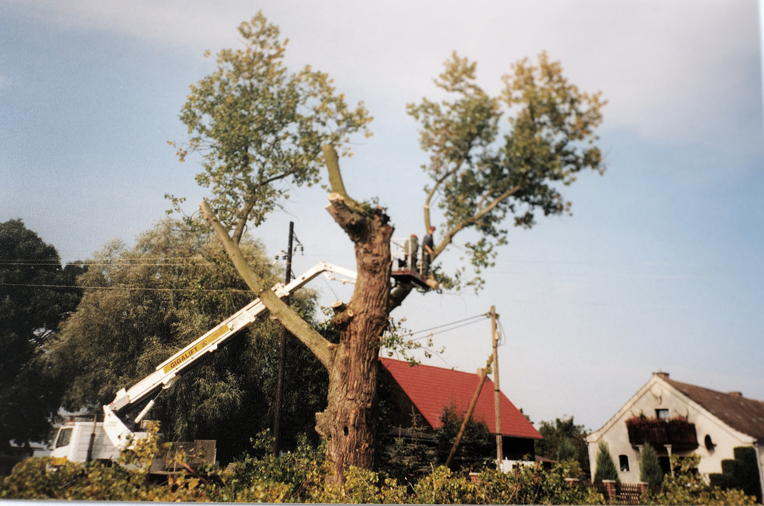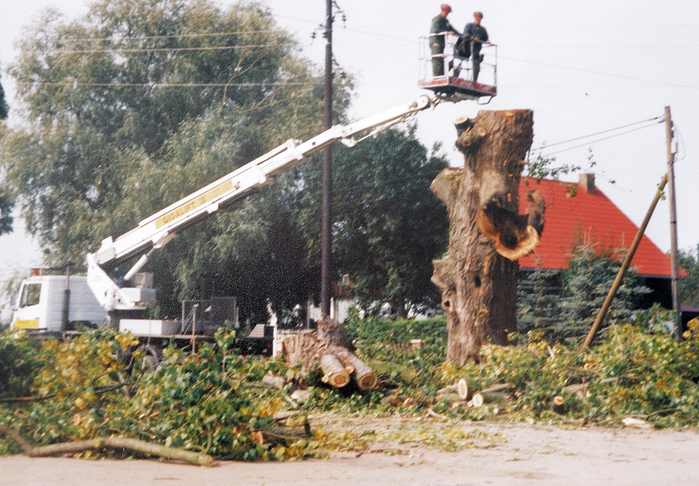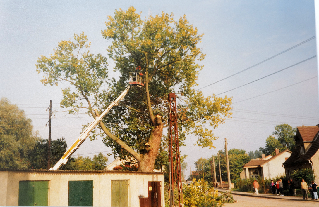Die Pappel war nach dem Erscheiungsbild wohl eine Eiche. Gesund und kräftig. Bis 1945 am Dorf an den Feldern. Jetzt den neuen Häusern eher zu nahe mit Wurzen, Blättern und Schatten.Oder Umgekehrt die neuen Häuser waren zu nahe herangebaut. 1987 die Freiheit dazu nutzend.