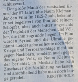 "Im Wesentlichen geht es um den Versuch, den Dialog zwischen diesen beiden Kulturen wiederzubeleben. Diesem Thema ist dieser Film gewidmet. Bevor ich Sie nun sozusagen mit diesem außergewöhnlichen Film allein lasse, möchte ich Hans Jürgen herzlich danken für die Möglichkeit, diese Filme zu zeigen, für die Vorführungen auf seinem Gelände parallel zu unseren und dafür, dass man mir, wie ich glaube, nun aufmerksam zuhört. "