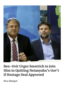 "Ich fordere meinen Kollegen, Finanzminister Bezalel Smotrich, auf, sich mir in voller Zusammenarbeit gegen diesen schrecklichen Deal anzuschließen... und dem Premierminister klar und entschieden anzukündigen, dass wir aus der Regierung austreten werden", sagte er.