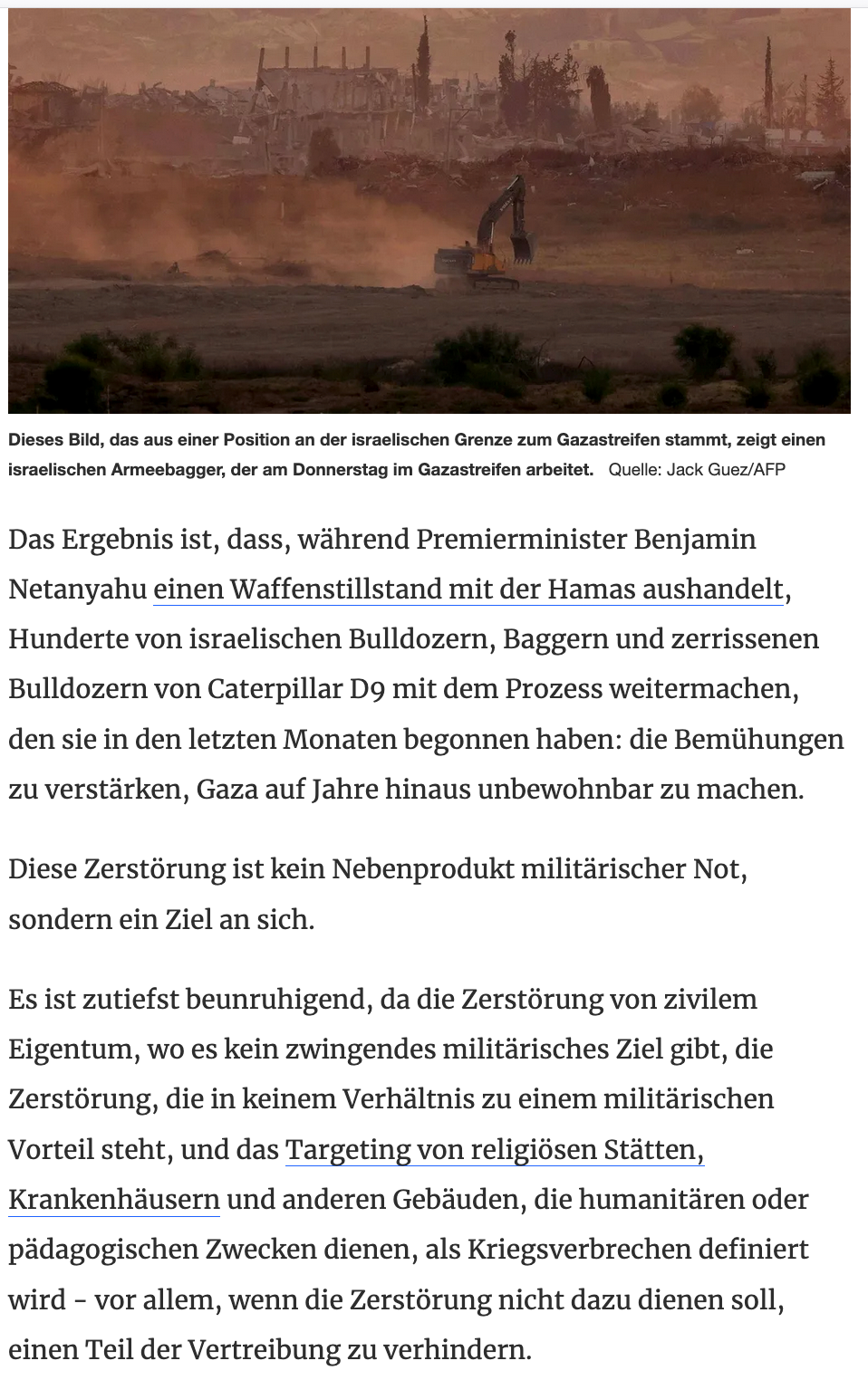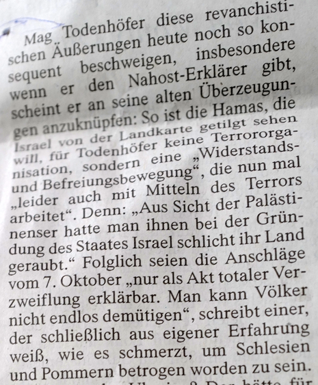 Interessant, wenn hier zum Thema Israel gleich die Oder-Neisse-Grenze einfällt und das deutsche Tabu dazu zustimmen zu müssen, nach unser Geschichte mit Polen. Denn Palästina ist nicht Polen und die Juden, die nach 1945 dort einfielen, waren nicht Verlierer eines Krieges mit den Bewohnern dort.