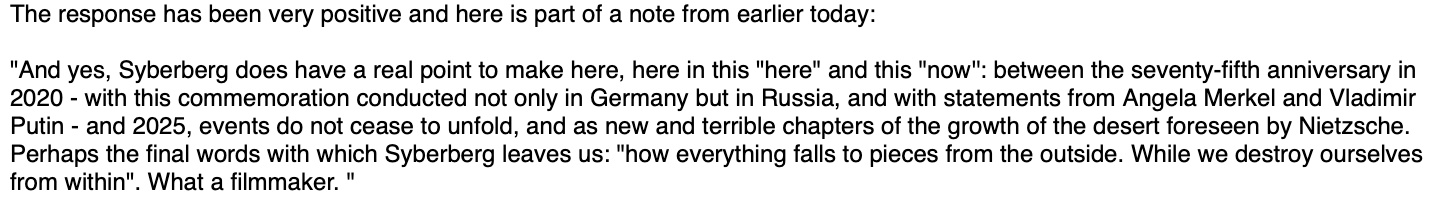 So eingeladen teilzunehmen wie wir das in eine Form brachten nach 80 Jahren. Zuerst als Raum am Ort des Geschehens und nun als Film, des Raums. Im Internet seit einer Woche weltweit.