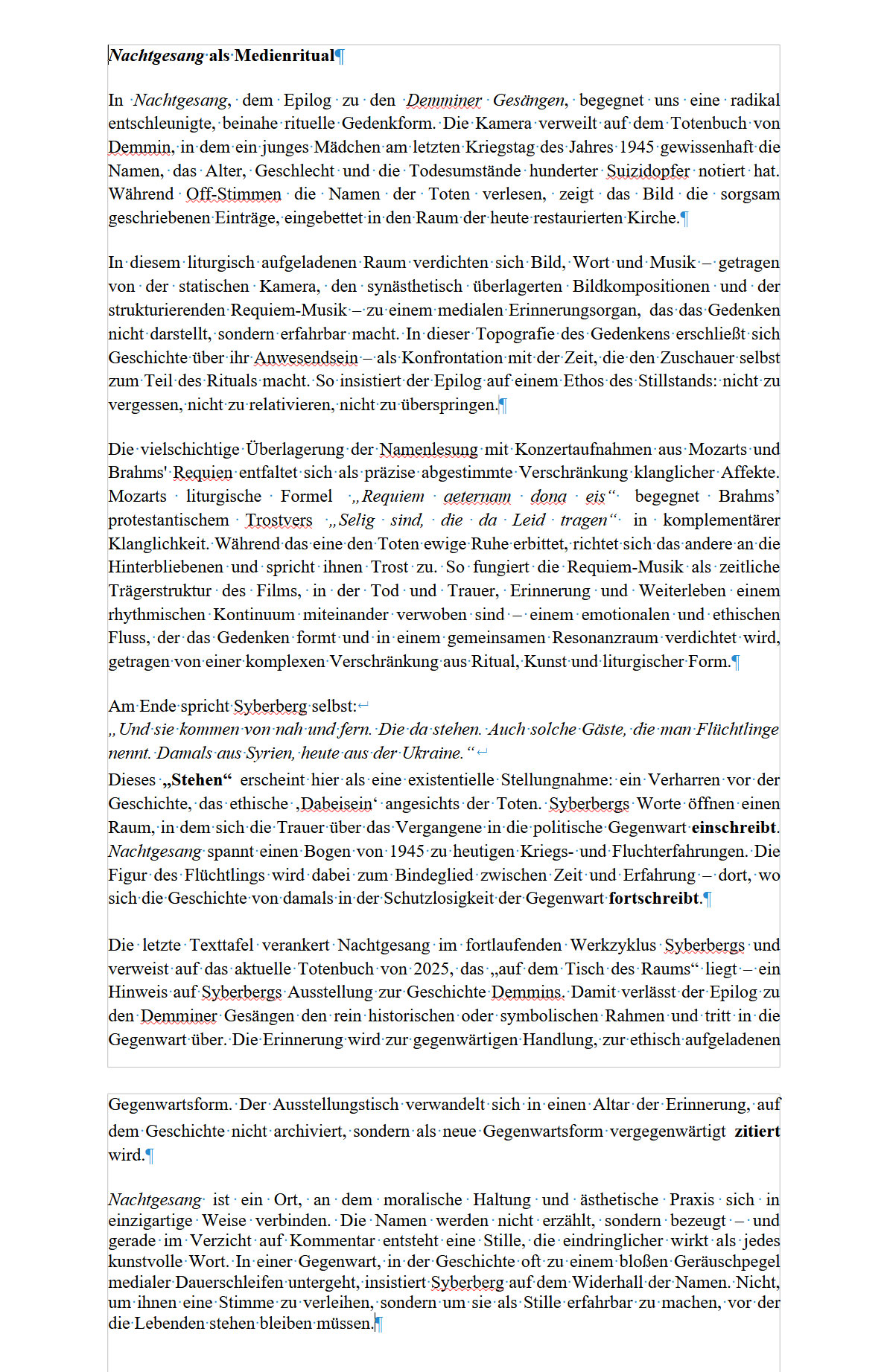 "Nachtgesang ist ein Ort, an dem moralische Haltung und ästhetische Praxis sich in einzigartige Weise verbinden. Die Namen werden nicht erzählt, sondern bezeugt – und gerade im Verzicht auf Kommentar entsteht eine Stille, die eindringlicher wirkt als jedes kunstvolle Wort. In einer Gegenwart, in der Geschichte oft zu einem bloßen Geräuschpegel medialer Dauerschleifen untergeht, insistiert Syberberg auf dem Widerhall der Namen. Nicht, um ihnen eine Stimme zu verleihen, sondern um sie als Stille erfahrbar zu machen, vor der die Lebenden stehen bleiben müssen."