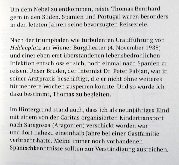 Das Buch der Letzten Reise von Thomas Bernhard nach Spanien endet 4 Wochen vor seinem Tod. Gestorben in Gmunden, das er danach mit besonderen Worten ehrte, nahe dem Ort, wo damals wohnte.