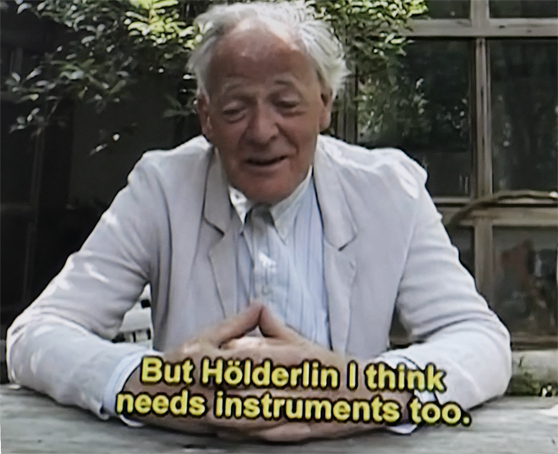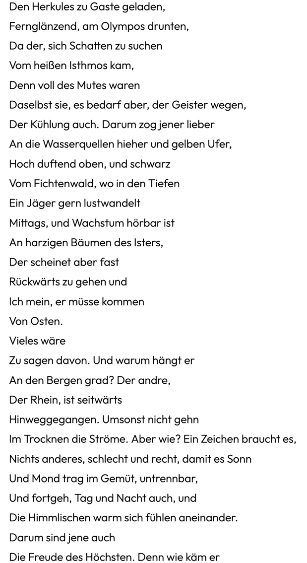 Der Text kommt aus der letzten Zeit Hölderlins, seines rationalen Bewusstseins vor dem Rückzug in den Tübinger Turm, und bedarf besonderer Beschreibung. Das versuchte Heidegger 1942 in einer dokumentierten Vorlesung, mitten im Krieg also. Nach dem Fall der Mauen in Deutschland und Europa wird beschrieben, wie Gorbatschev und Schewardnadze von Deutschland erwarteten das zu sein, was ein Hölderlin hinterliess. Das alles in diesem Film benannt. Seit 25Jahren im Internet und auf Festivals, in Rottderdam angefangen. Und von Heidegger gelesen . (1800-1942-1989/1992-2000/2004-2025)