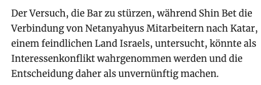 Vor einigen Wochen beschloss Bar zusammen mit der israelischen Polizei, eine Untersuchung gegen zwei von Netanjahus Sprechern und einem ehemaligen strategischen Berater wegen ernsthaften Verdächtigungen von zweifelhaften Verbindungen und Finanztransaktionen mit Katar einzuleiten, einem Land, das terroristische Organisationen, einschließlich der Vereinbarungen, die während des Krieges gemacht wurden - unterstützt. "Katargate", wie der Skandal genannt wurde, hat das Potenzial, zu Anklagen wegen Verhaltensvorrat zu führen, die an Verrat grenzen.