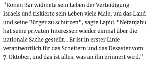 Es gibt eine große, berechtigte Sehnsucht in Israel, Netanjahu zu entfernen, aber Sie sind nicht die Person, die uns vor seinem Regime retten kann. Wenn der Weg zur Rehabilitation durch die Köpfe des Shin Bet geht, dann ist es nicht der richtige Weg. Die Tatsache, dass Sie und Ihre Art die selbsternannten Agenten des Wandels sind, ist ein unwiderlegbarer Beweis dafür, dass es in Israel keine Alternative und keine Opposition gibt, schon gar nicht von links.