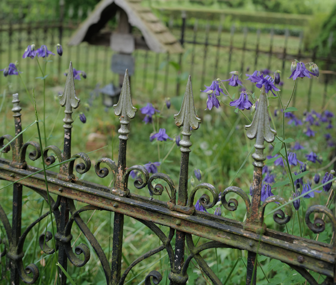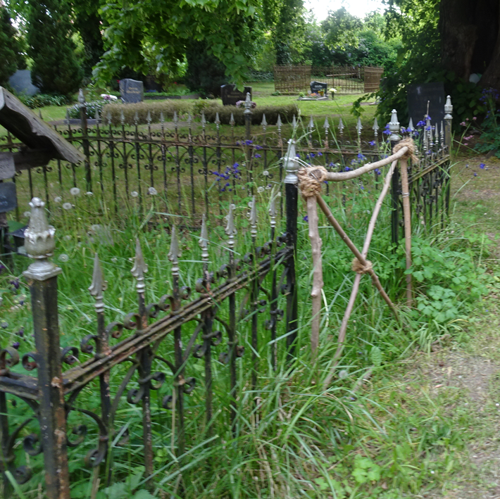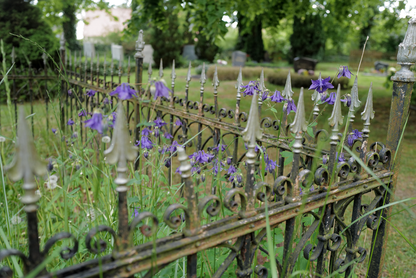 Das eisene Gitter umkreist wachsem das kleine Geviert.