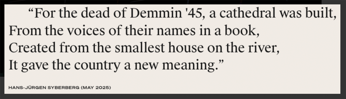 Da es nicht nur um Demmin geht, der Stadt an der Peene(Pennemünde), sondern um das Kriegsende in Europa vor 80 Jahren und wie wir damit umgehen, heute als Form und Haltung, könnte es Modell sein in diesen Zeiten neuer Kriege, nun des AtomZeitalters unter den Siegern von damals.