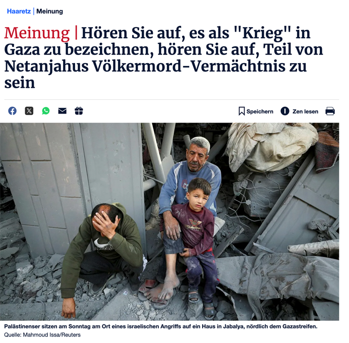Wie die Kommandeure sind auch die daran beteiligten Soldaten mitschuldig. Eine Minderheit von ihnen wird es eines Tages bereuen. Die anderen werden die Schuld verdrängen. Und was werden sie ihren Kindern sagen? Dass sie Gaza nivelliert haben? Dass sie Krankenhäuser und Schulen beschossen haben? Aber es war nicht auf die Regierung und die Armee beschränkt. Es gab diejenigen, die Deckung zur Verfügung stellten, die ermutigten, schürten, verschwiegen und logen – die überwiegende Mehrheit der israelischen Medien. Es wird auch die Zerstörung des Gazastreifens zugeschrieben. Es war daran beteiligt – und wie. Das ist der Tiefpunkt der israelischen Medien.