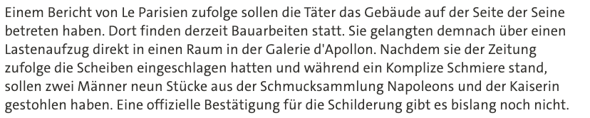 Im weltberühmten Louvre-Museum in Paris hat es heute nach Angaben der französischen Kulturministerin Rachida Dati einen Raubüberfall gegeben. Es sei niemand verletzt worden. Nähere Details zum Tathergang oder was genau gestohlen wurde, nannte sie zunächst nicht.