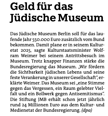 mehr Geld für jüdisches Museum in Berlin. Dort Ausstellung Schocken Verleger und Gründer von Haaretz. Keine deutsche Zeitung, kein TV mit Zitaten, Gästen aus Haaretz, wenn sie von Israel sprechen, aktuell.