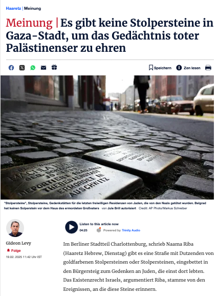 Im Berliner Stadtteil Charlottenburg, schrieb Naama Riba (Haaretz Hebrew, Dienstag) gibt es eine Straße mit Dutzenden von goldfarbenen Stolpersteinen oder Stolpersteinen, eingebettet in den Bürgersteig zum Gedenken an Juden, die einst dort lebten. Das Existenzrecht Israels, argumentiert Riba, stamme von den Ereignissen, an die diese Steine erinnern.