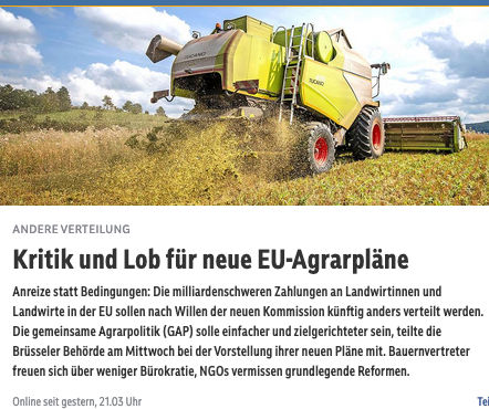 Marco Contiero, Direktor für EU-Agrarpolitik bei Greenpeace, warnte, die „Vision“ der EU-Kommission scheine nicht zu erkennen, dass sich das Landwirtschaftssystem grundlegend wandeln müsse. Die EU-Agrarpolitik zahle „enorme Summen öffentlicher Gelder in ein Modell, das die Natur zerstört, milliardenschwere Landbesitzer belohnt, kleine Bauernhöfe in den Ruin treibt und ländliche Gemeinden aushöhlt“, kritisierte Contiero den „Tunnelblick der Kommission“.
