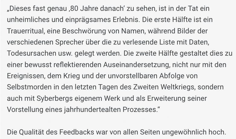 "Watching this almost exactly '80 years after,' is indeed an uncanny and memorable experience. The first half is a mourning ritual, an incantation of names while images of the various speakers are superimposed with the list to be read, showing dates, causes of death and so on. The second half makes this into a more deliberately reflective reckoning, not just with the events, the war, and the unimaginable succession of suicides during the last days of the Second World War, but also with Syberberg's own work, and as an extension of his notion of a centuries-old trial."
