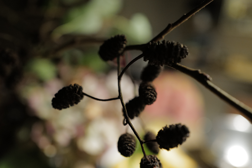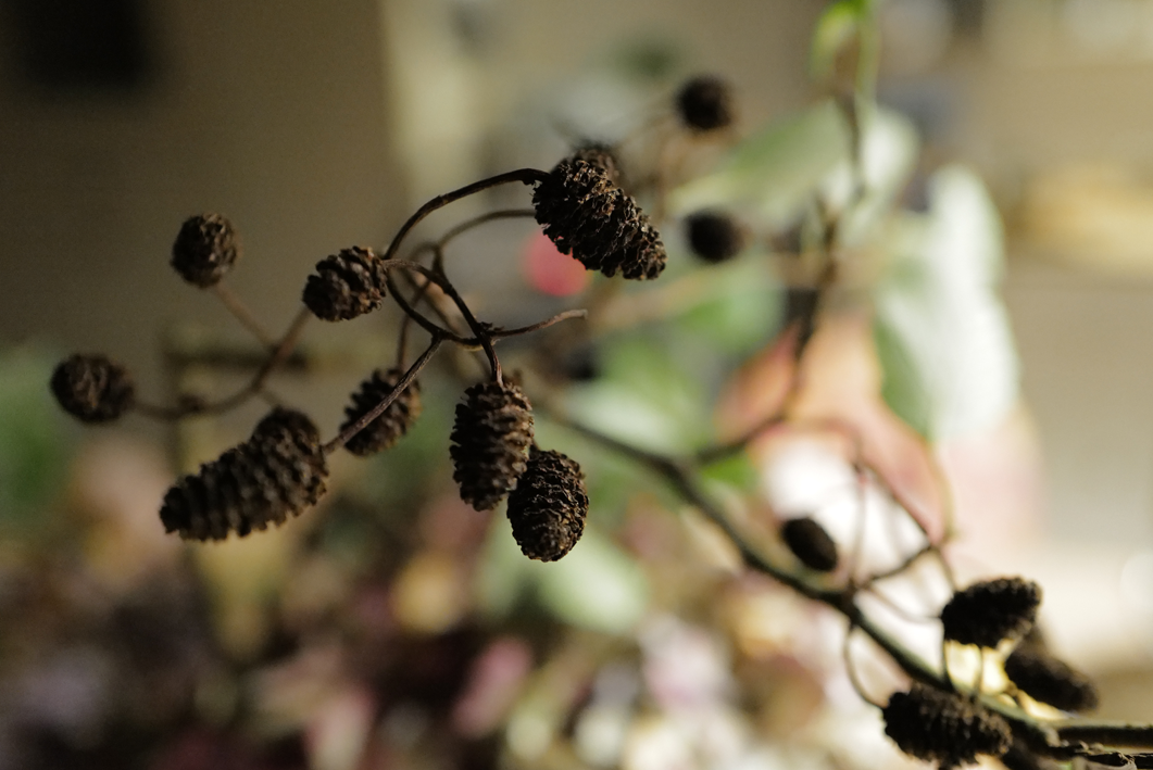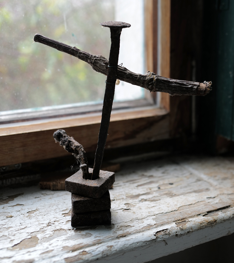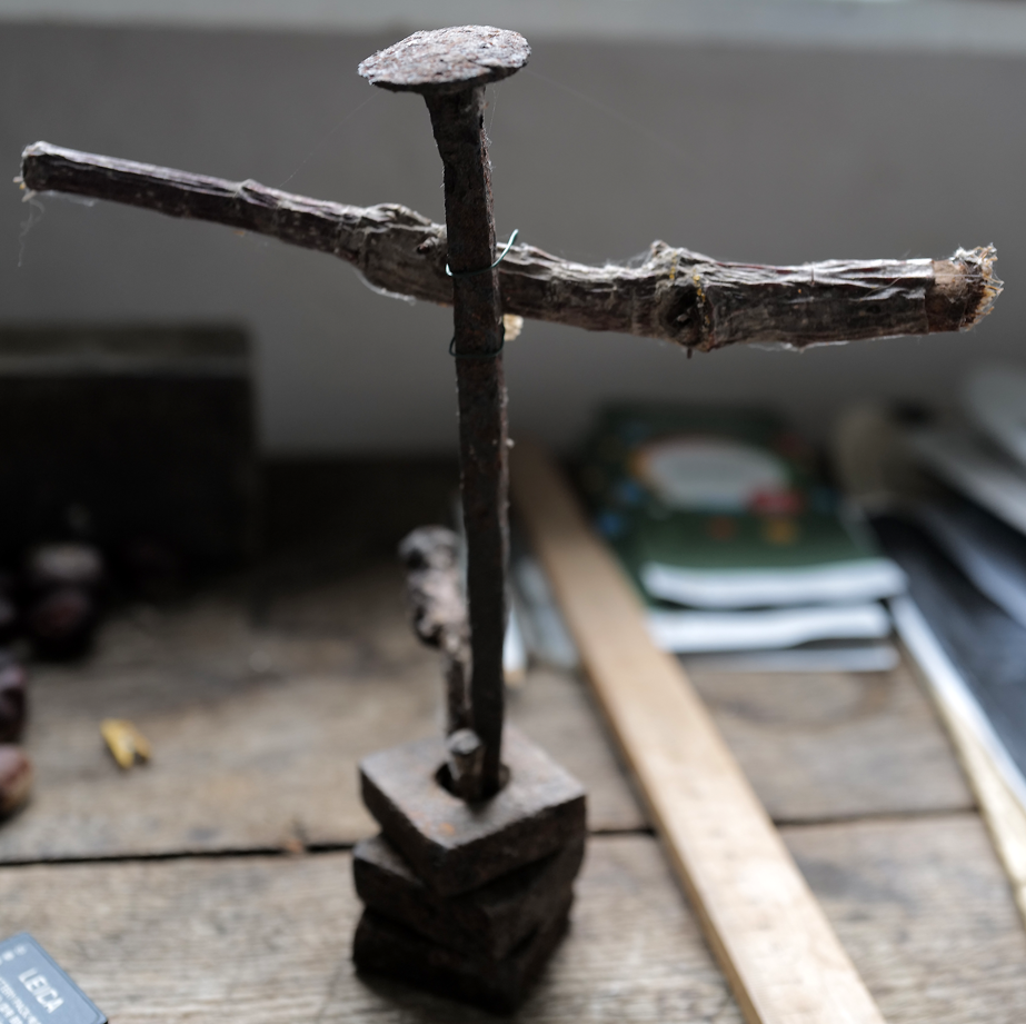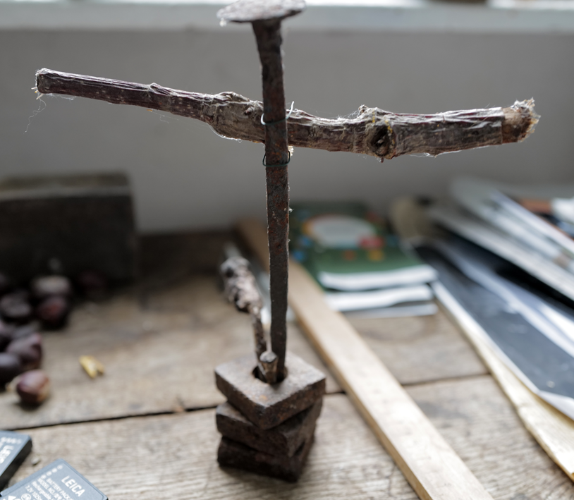Aus dem Nagel des Turms der Kirche in N. und den verholzten Zweigen der abgestorbenen oder mehrfach beschädigten Bäume am Kellergang in Demmin, nun wieder durchgekommen aus erstem Trieb. In den alten Eisenringen vom Turmbau gehalten.