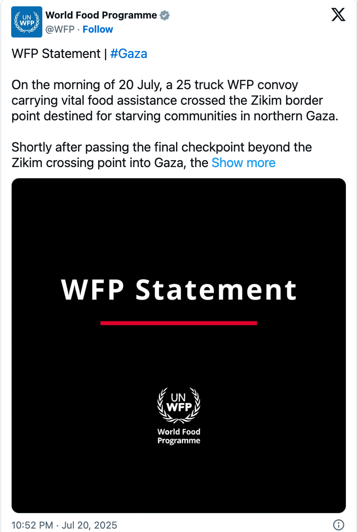 On the morning of 20 July, a 25 truck WFP convoy carrying vital food assistance crossed the Zikim border point destined for starving communities in northern Gaza. Shortly after passing the final checkpoint beyond the Zikim crossing point into Gaza, the convoy encountered large crowds of civilians anxiously waiting to access desperately needed food supplies. As the convoy approached, the surrounding crowd came under fire from Israeli tanks, snipers and other gunfire. We are deeply concerned and saddened by this tragic incident resulting in the loss of countless lives. Many more suffered life-threatening injuries. These people were simply trying to access food to feed themselves and their families on the brink of starvation. This terrible incident underscores the increasingly dangerous conditions under which humanitarian operations are forced to be conducted in Gaza.