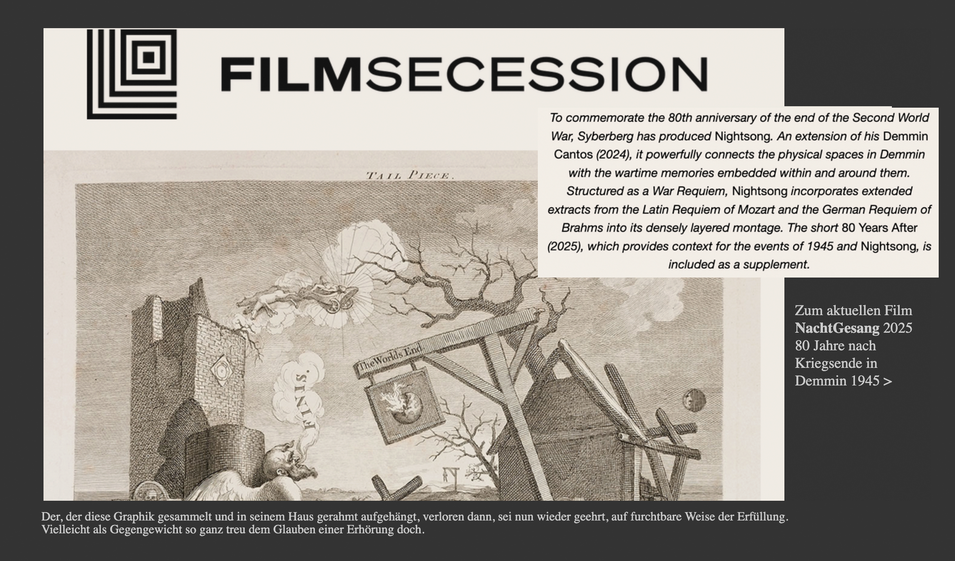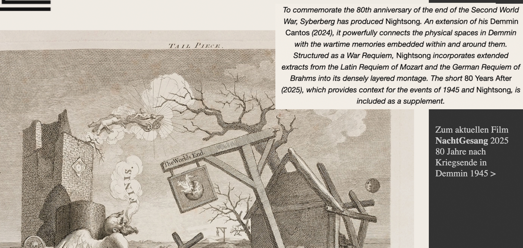 Als R. S. aus den USA dieses Bild von William Hogarth zur Einführung des NachtGesangs aus Demmin von 1945 wählte, war uns das zu weit weg und zuviel -von Max Reinhardt aus dem Nachlass nach seiner Flucht 1938 gesammet- als Vision vom Ende der Welt . Jetzt bezeichnet es exakt die Notwendigkeit des Films. Aus diesem Abseits der Chor der Toten . Mit Musik noch bei uns.