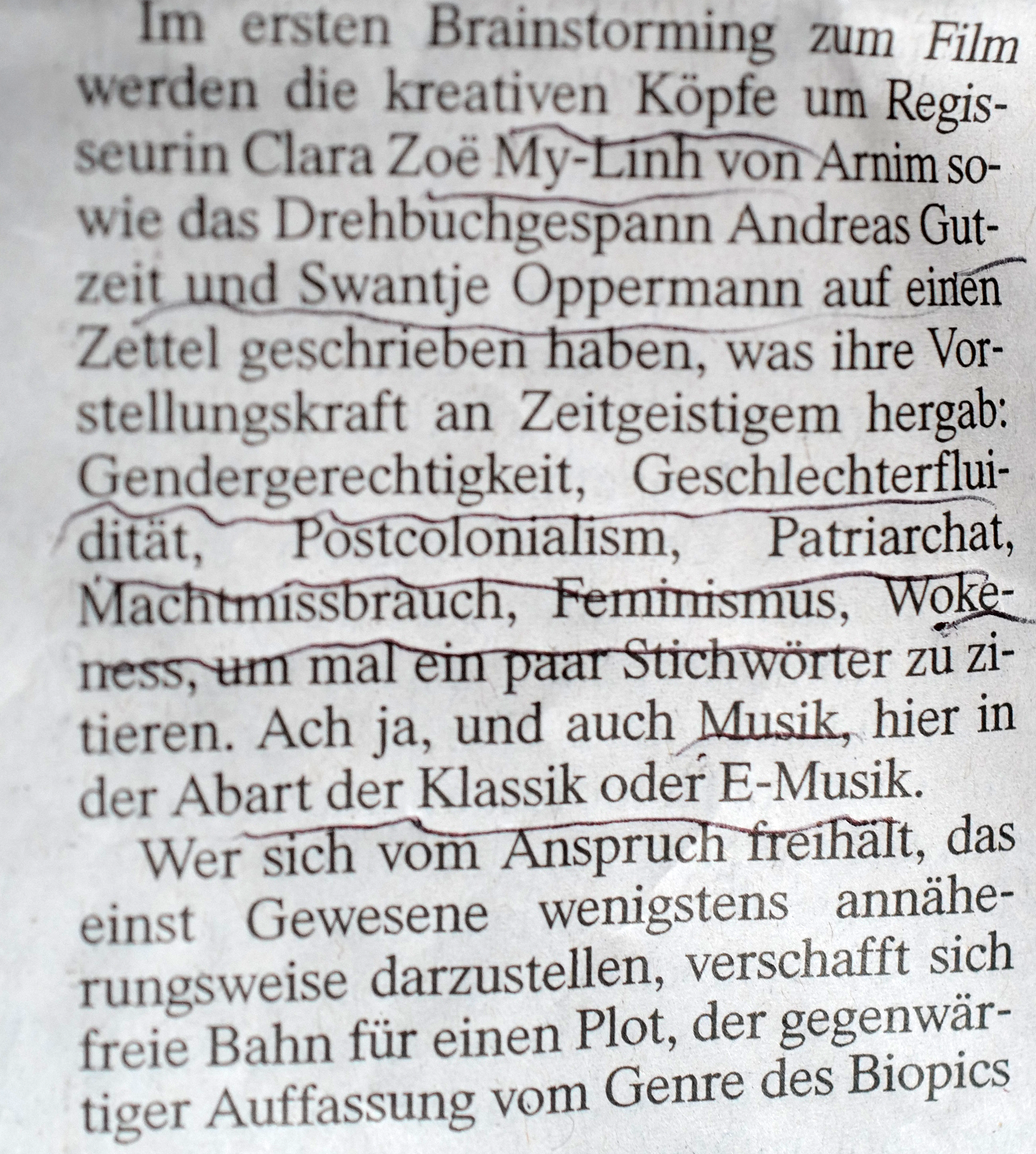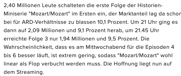 Warum ist diese öffentliche Verhandlung wichtig, im Sinne letzter Lebensspuren unserer Kultur. Vieles ging verloren. Die Musik ist letztes Gut in den Medien als Film in diesem Fall an öffentliche Organe unserer Sozietät gebunden. Wenn, wie an diesem Beispiel offenbar, fahrlässig okkupatativ damit umgegangen wird, muss das zum Fall werden . Wenn Mozart -eindeutig definiert- draufsteht und absichtlich nicht an seinen Dimensionen gemessen, geliefer wird, müssen wir fragen, von wem und warum so verantwortet. Zu wessen Kosten. Und mit dieser bisher absehbar negativen Resonnanz. Zumal der nächste Fall dieser Art - gemessen an den Ankündigungen- vor der Tür steht: das wäre Ludwig II als The King. >("mit einer hochkomplexen Psyche in einem LGBTIQA+ feindlichen Umfeld, jedoch auch Auslöser von #MeToo Debatten und dann selbst wieder Opfer von Fake News"). Vorsicht Richard Wagner untrennbar aber nicht aus Bayreuth heute.