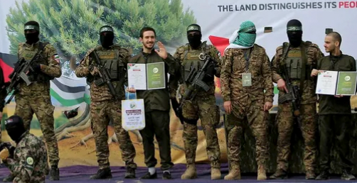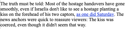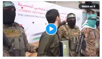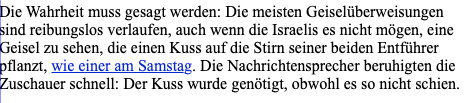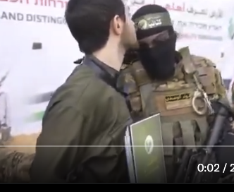einer der Befreiten beugt sich vor und küsst seinen maskierten Bewacher mit MP auf die mit Waffen verdeckte Stirn. Rettend. (GL Haaretz)