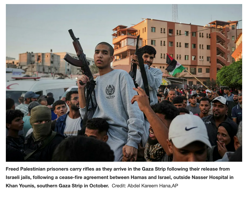 Befreite palästinensische Gefangene tragen Gewehre, als sie nach ihrer Entlassung aus israelischen Gefängnissen nach einem Waffenstillstandsabkommen zwischen Hamas und Israel im südlichen Gazastreifen im Oktober im Gazastreifen in den Gazastreifen kommen.Bild: Abdel Kareem Hana, APIsrael war stolz auf die Bedingungen seiner Haft damals. Heute ist die Regierung stolz auf Sadismus, Missbrauch und Folter. Das tut sie, weil sie die Seelen ihrer Bürger kennt. Die Mehrheit der Israelis ist rachsüchtig und billigt den Missbrauch.