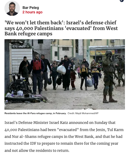 Israel wartet nicht auf Trump – und treibt bereits eine Politik der ethnischen Säuberung gegen Palästinenser voran. Am Sonntag sagte Israels Verteidigungsminister Israel Katz, dass etwa 40.000 Palästinenser aus Flüchtlingslagern im Westjordanland "evakuiert" wurden, während er schwor, dass Israel sie "nicht zurücklassen wird". Letzte Woche kündigte er die Einrichtung einer neuen Direktion in seinem Ministerium an, die es den Palästinensern ermöglichen soll, aus Gaza zu verlegen.