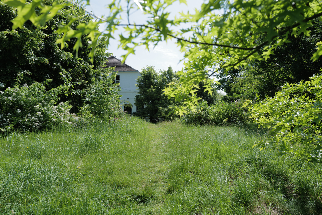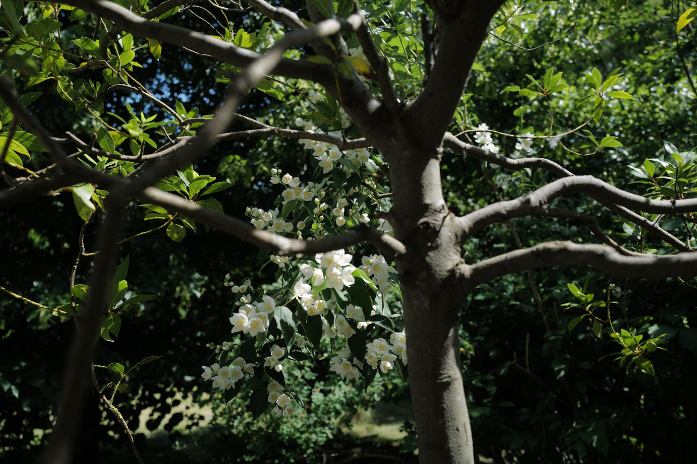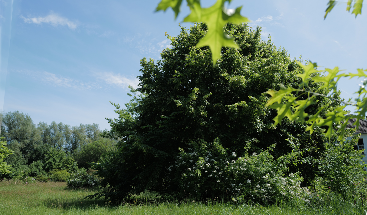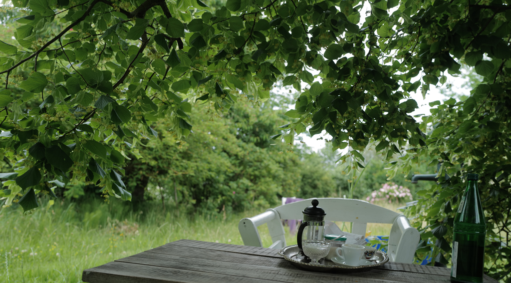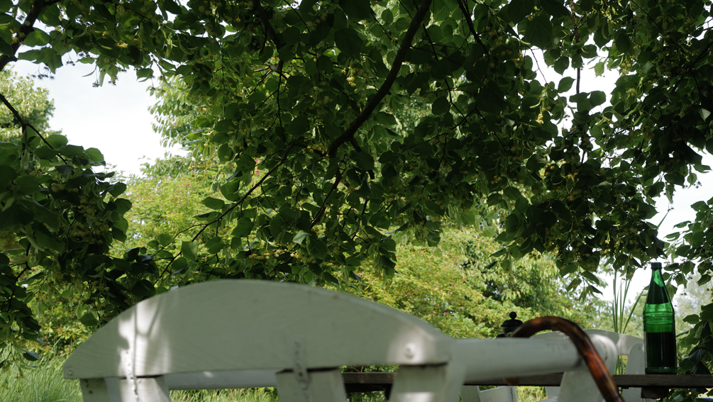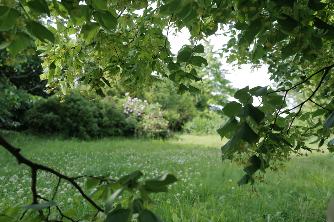 im Halbschatten der Linde blühemd was vor ihr stehenblien nach dem Sturz