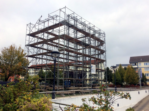 unter der Fassade das Gerüst für 2 Wochen wie ein fest Burgüber dem Loch eines Parkplatzes unter der Erde des Rathauses