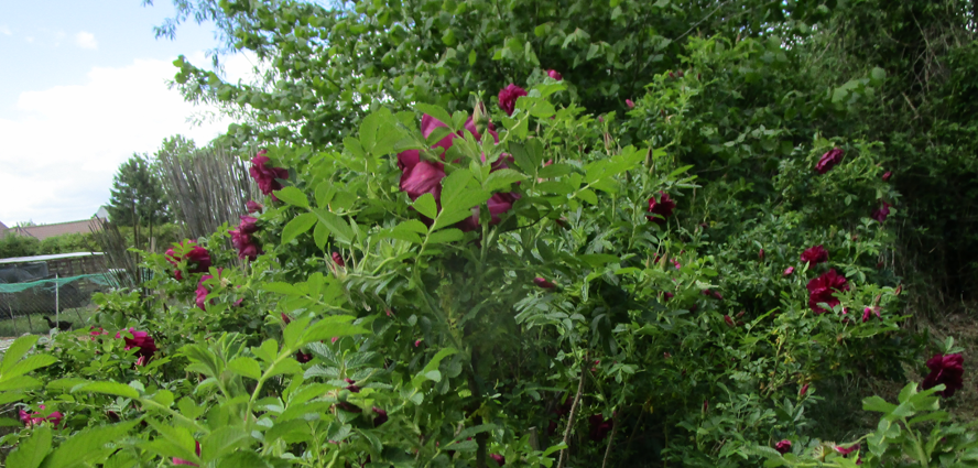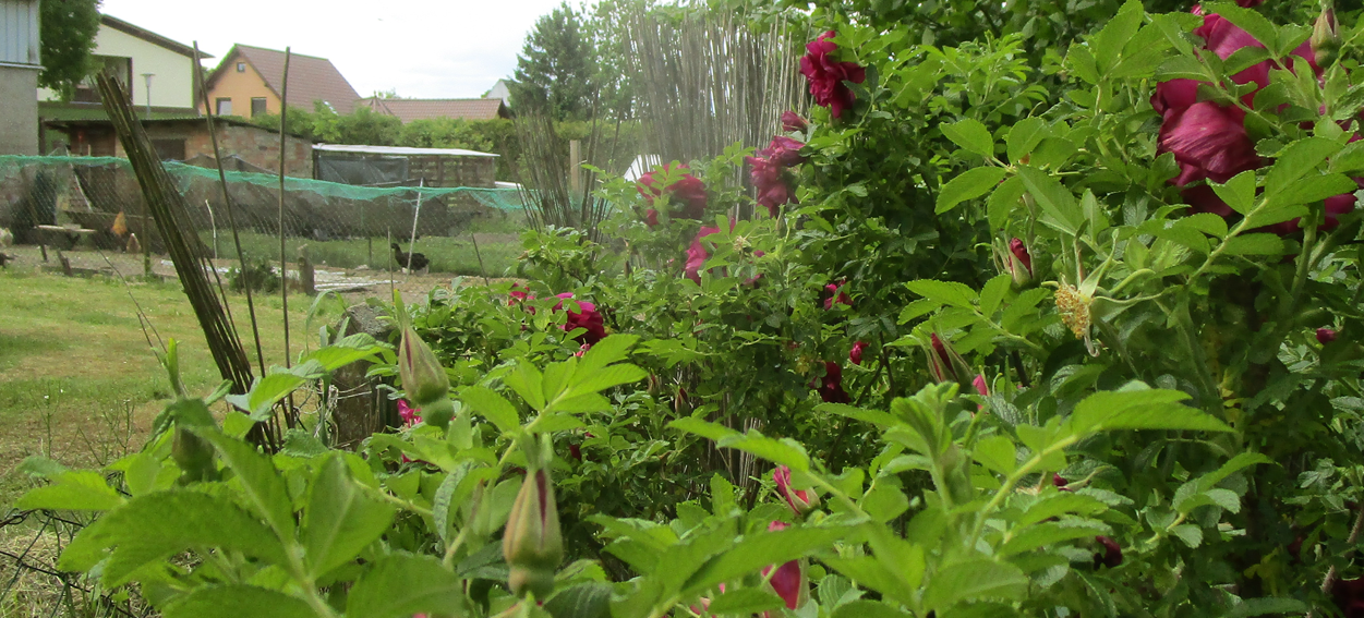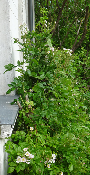 Im Glashaus. Die Erste des Mohns und die Ersten der Multiflora am Haus